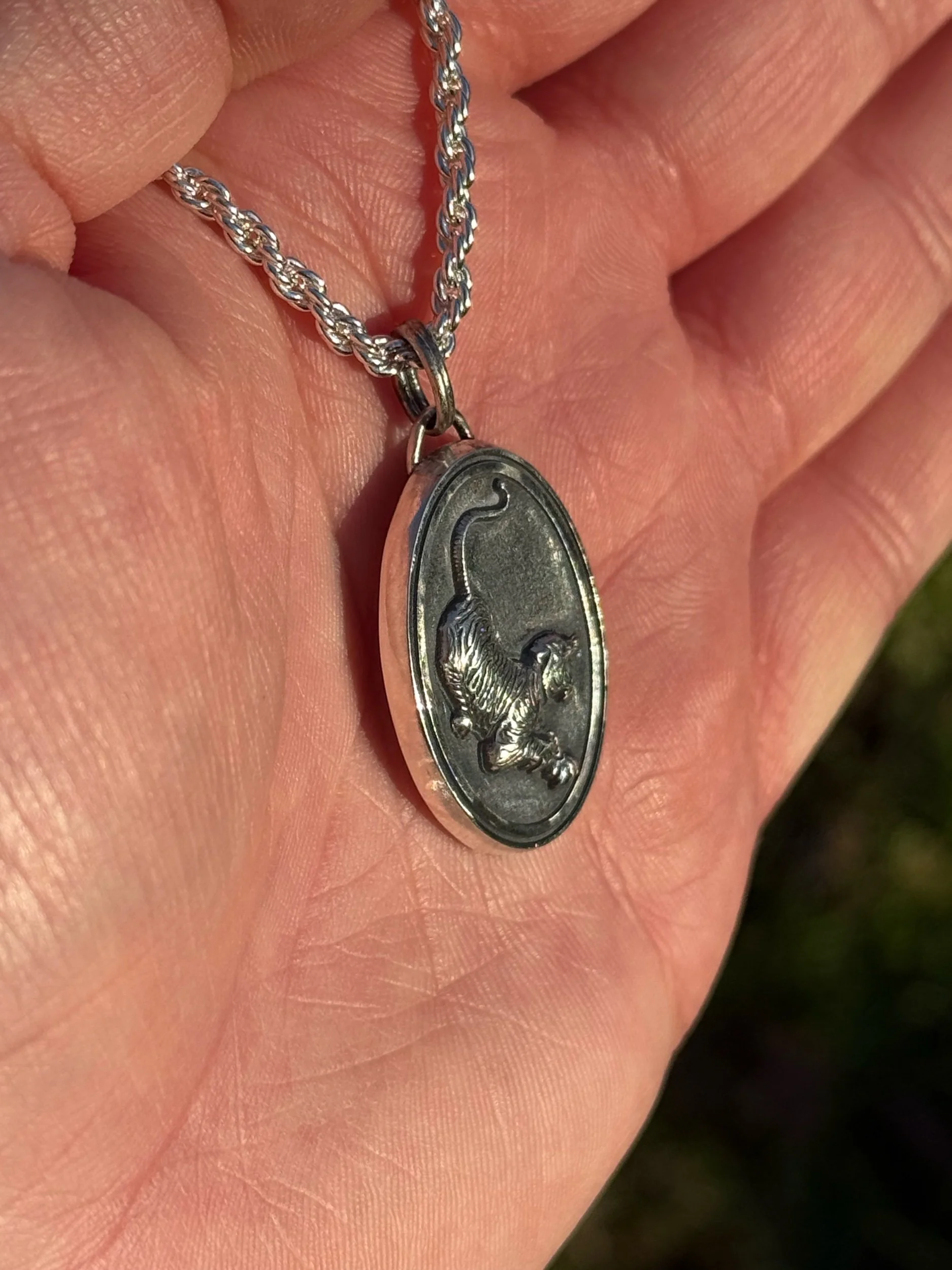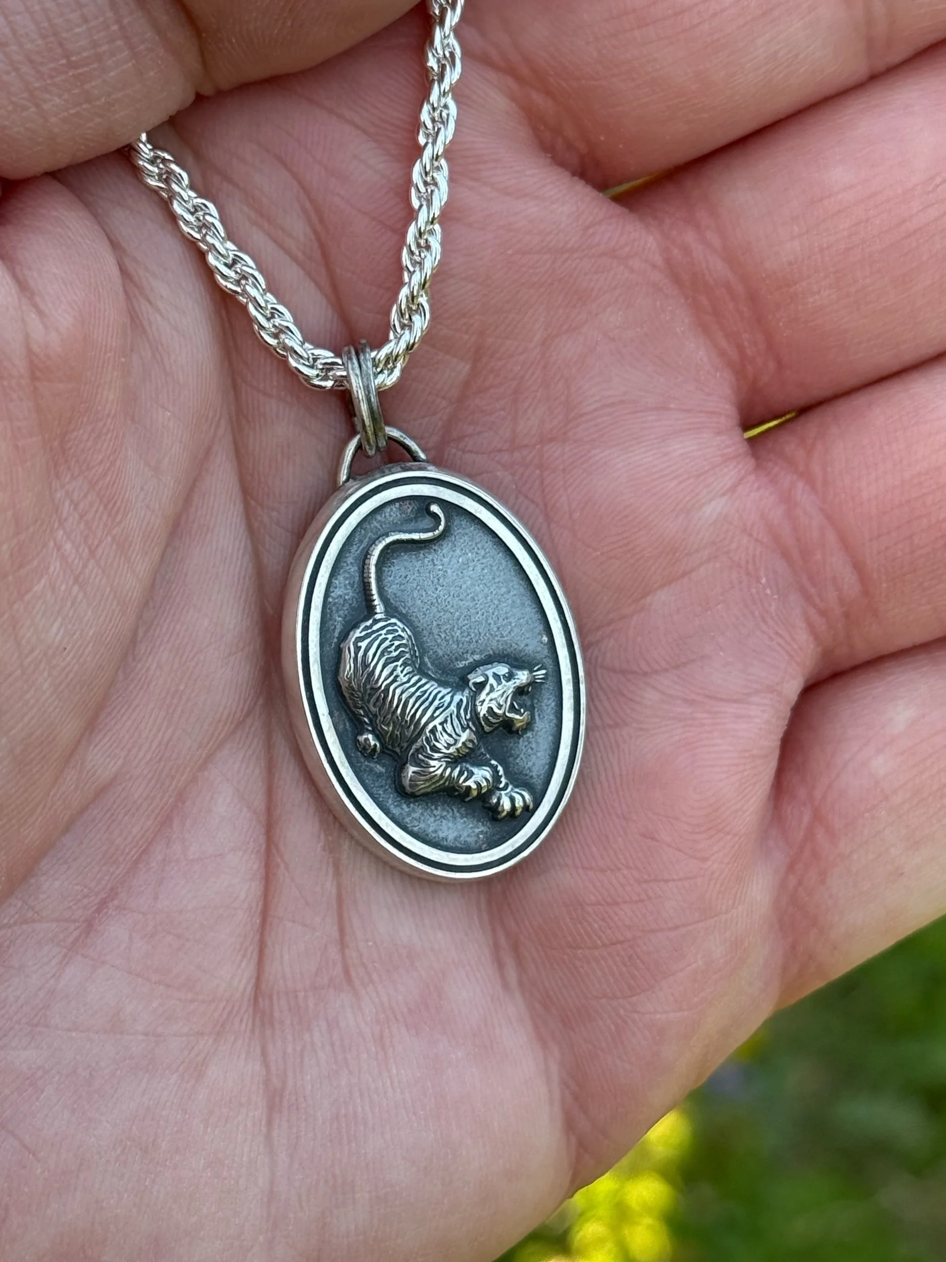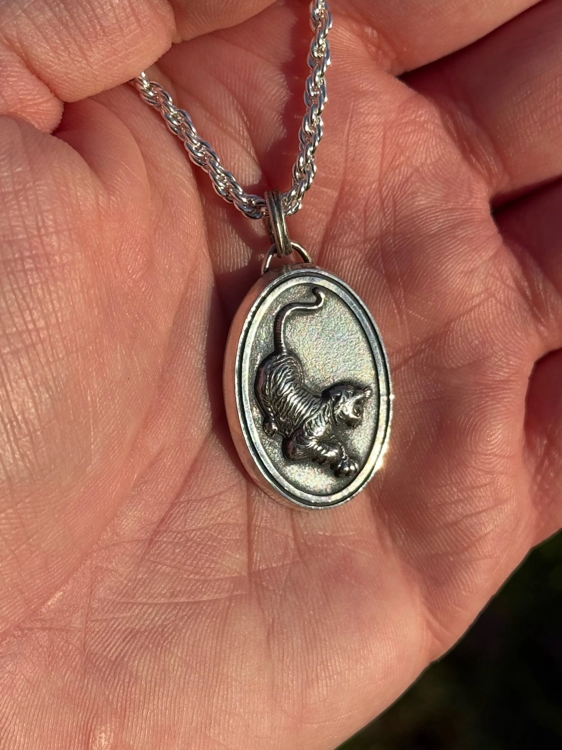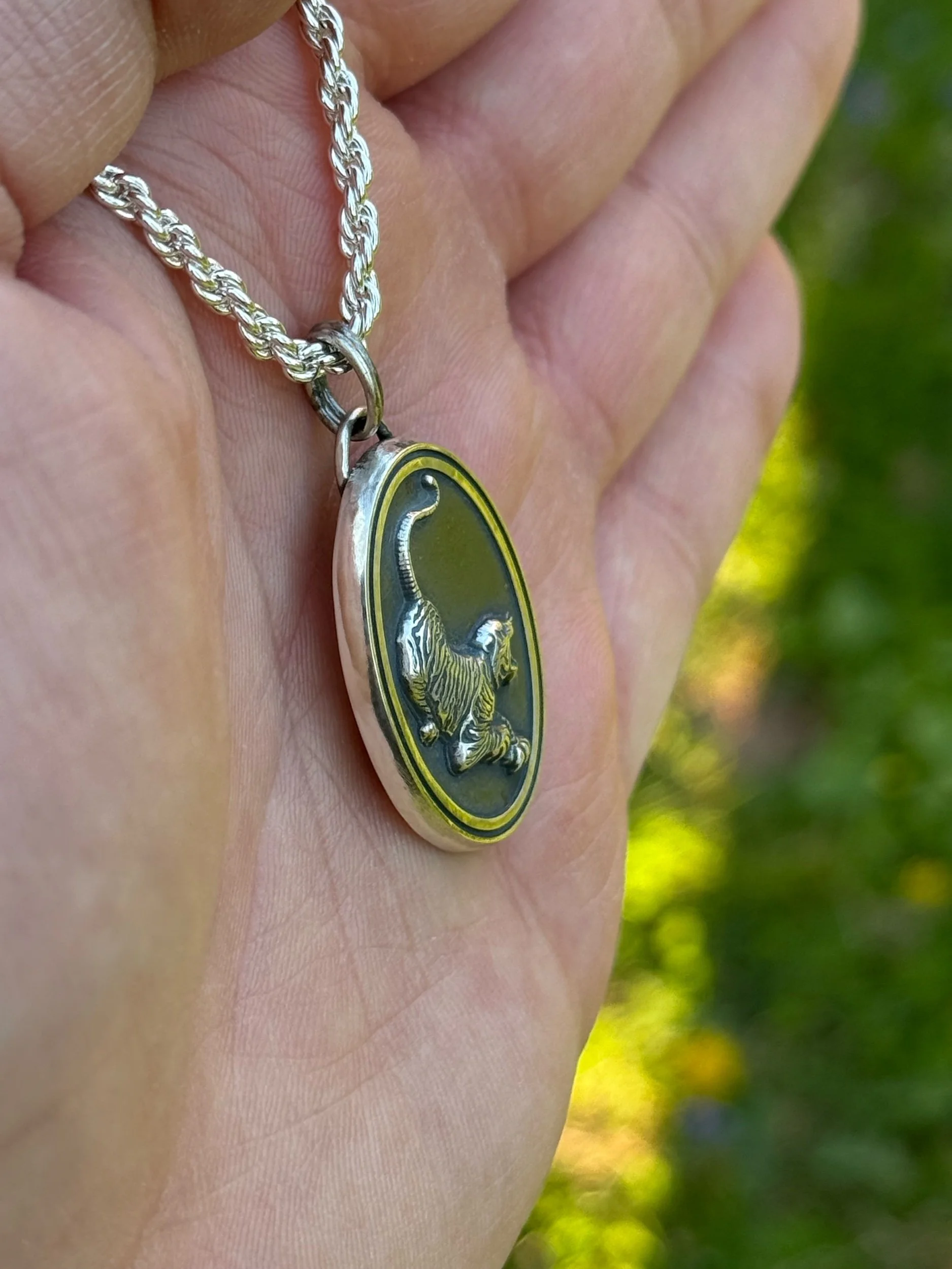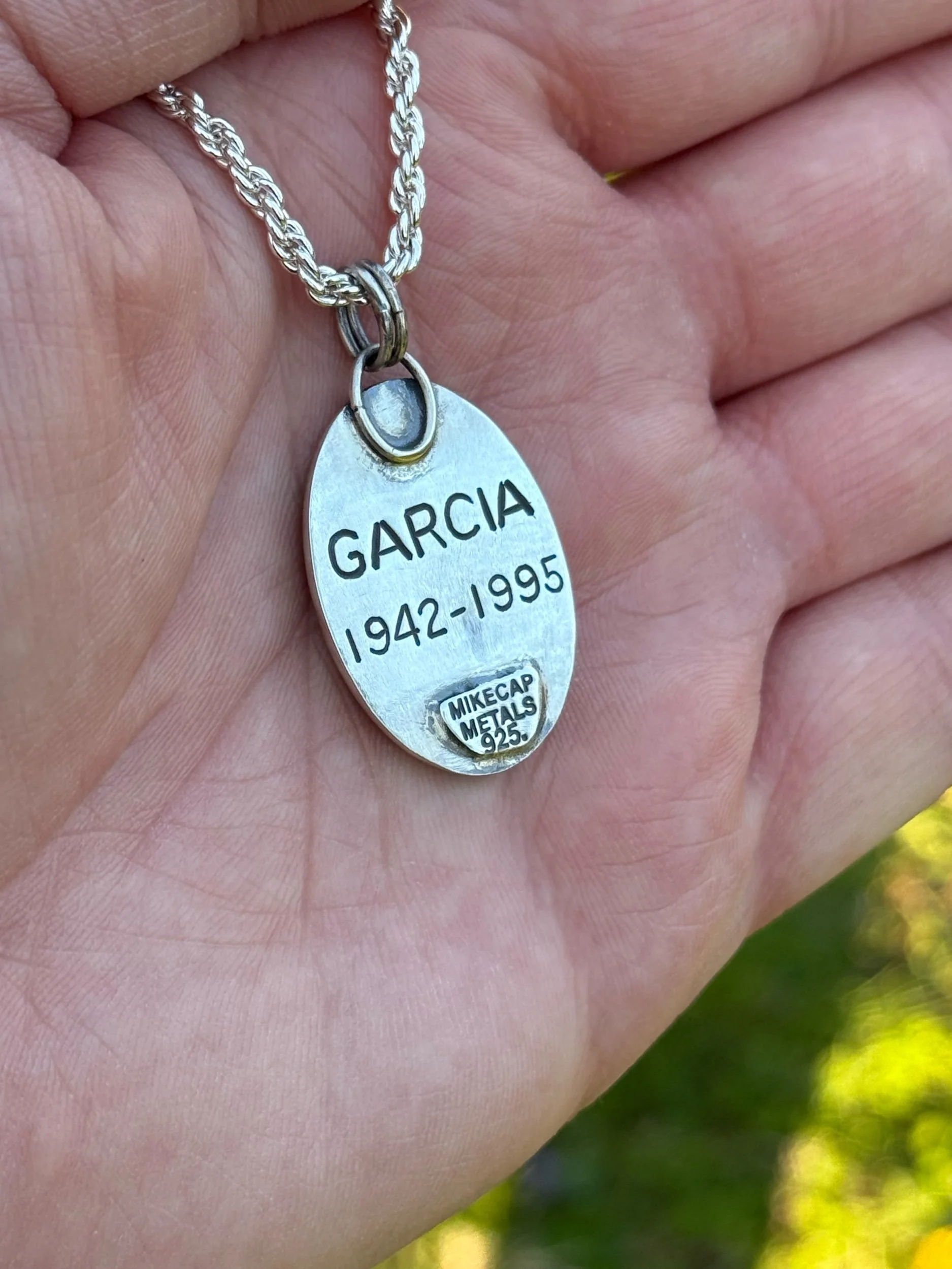 This hand fabricated sterling silver pendant pays homage to the Jerry Garcia tiger guitar. It the thickness of two quarters stacked and measures 1.25”x 3/4”. This piece is priced based on the six hours labor, large amount of silver, and many expensive hand tools required to make this piece. Please message me if you have any further questions. Chain is not included.