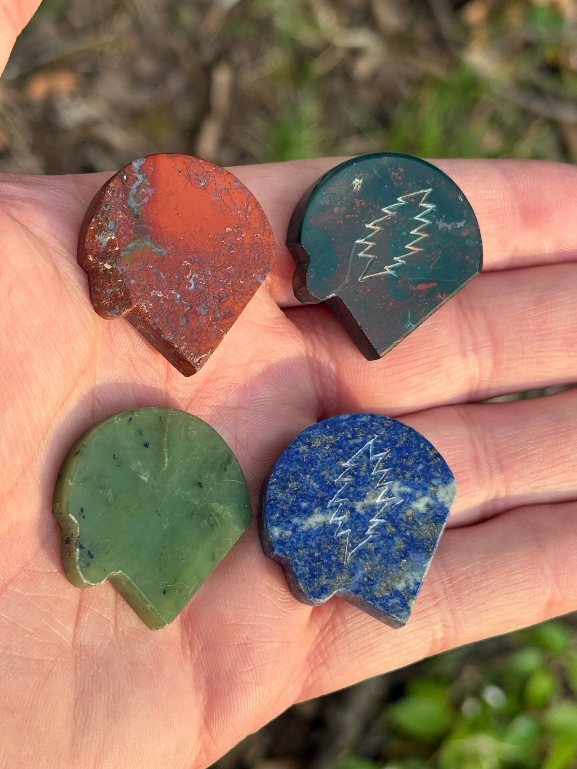 Hand fabricated and engraved in your choice of gemstone this piece features the iconic cats down under the stars design. Please message me first to see which carved cats gemstones are available before ordering. The light green is jade, dark green is bloodstone, red is red jasper, and blue is lapis lazuli. Does not come with a chain.
